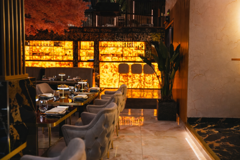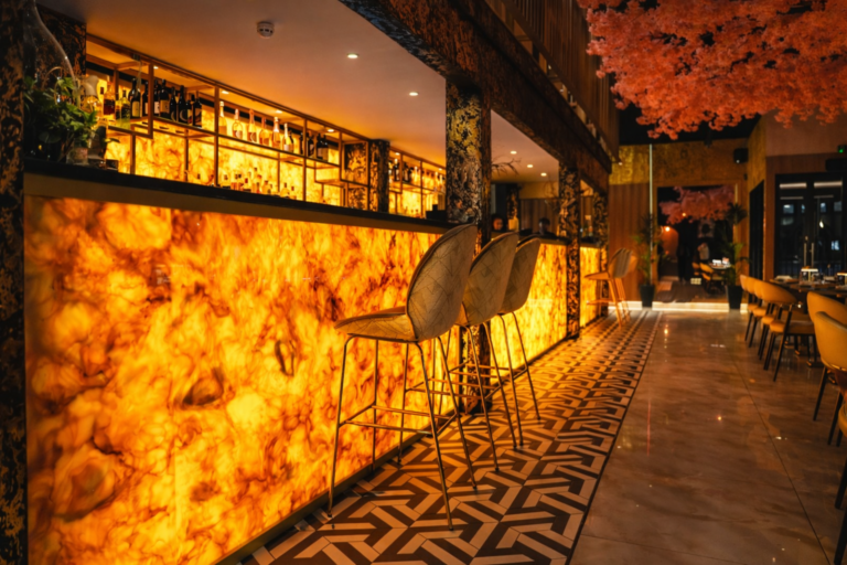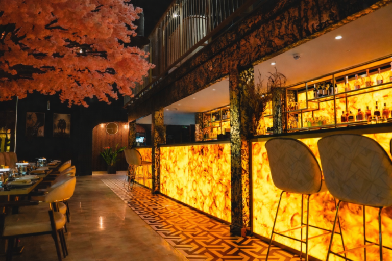 On the Ground level, immerse yourself in a serene dining experience surrounded by a palette of gold and white. A focal point of this space is the majestic cherry blossom tree, creating a captivating ambiance. The bar counter, a masterpiece in itself, beckons with gold accents, offering a perfect spot to savor handcrafted libations.