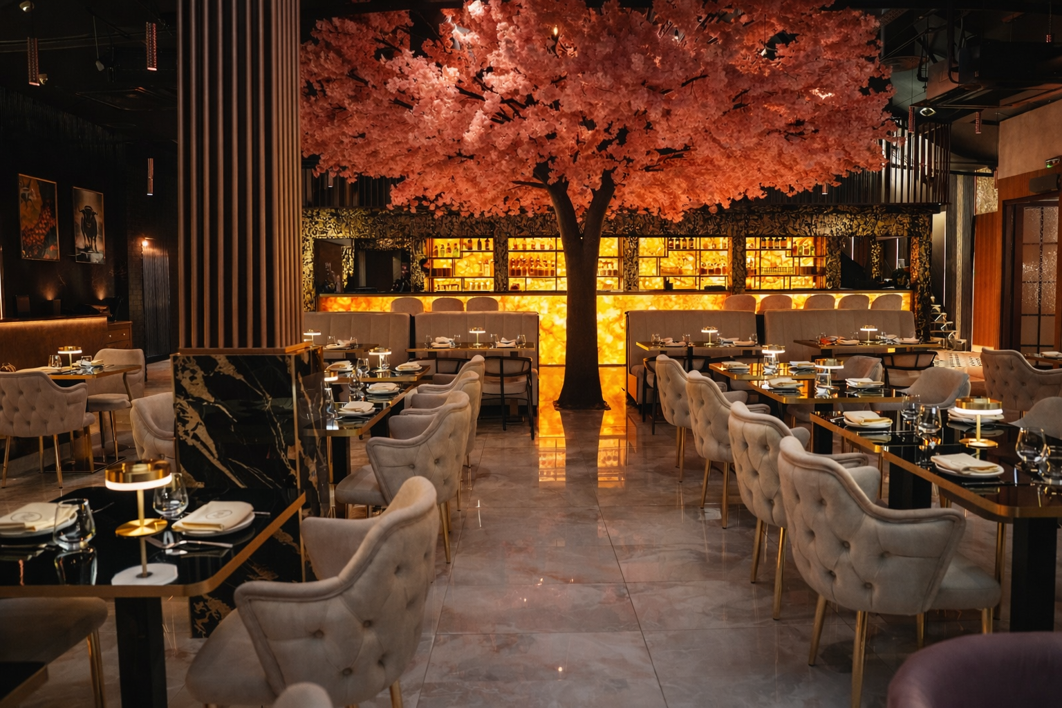 On the Ground level, immerse yourself in a serene dining experience surrounded by a palette of gold and white. A focal point of this space is the majestic cherry blossom tree, creating a captivating ambiance. The bar counter, a masterpiece in itself, beckons with gold accents, offering a perfect spot to savor handcrafted libations.