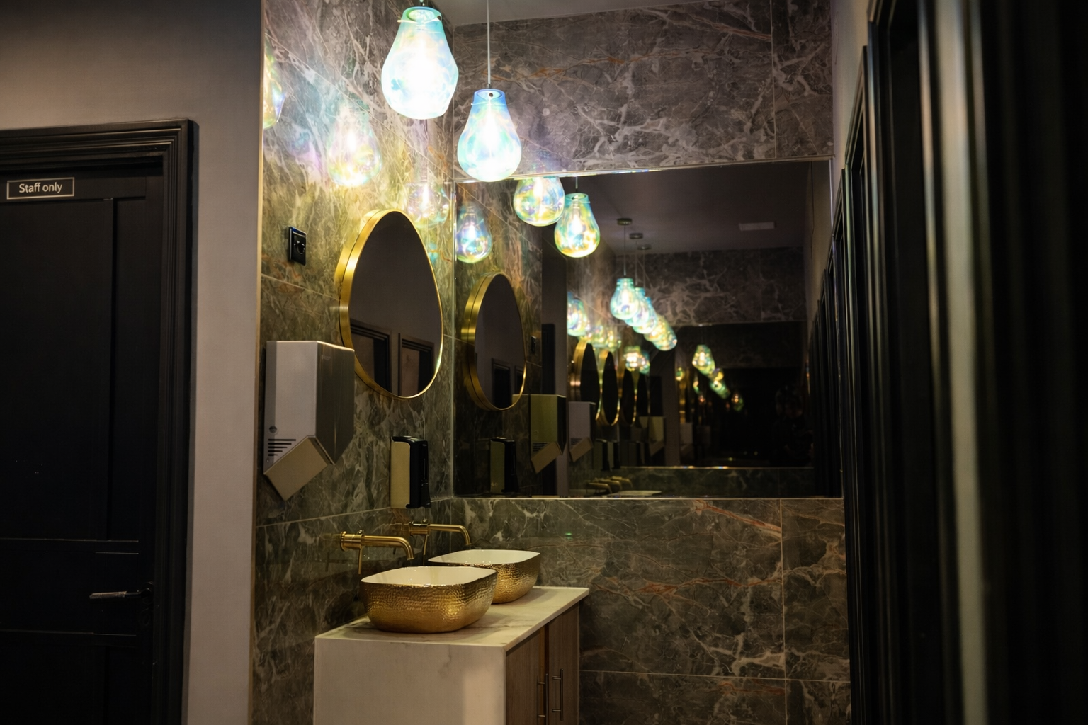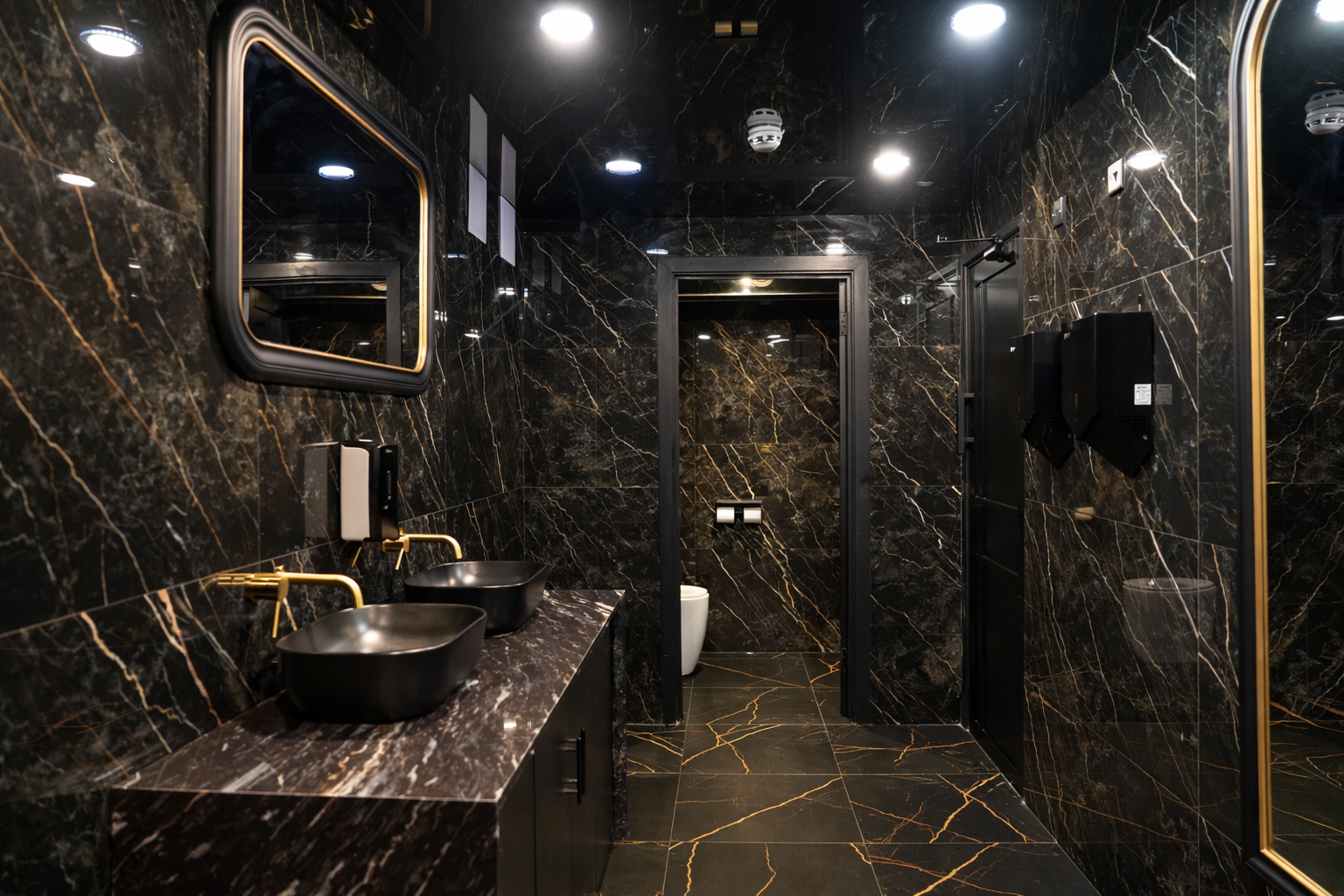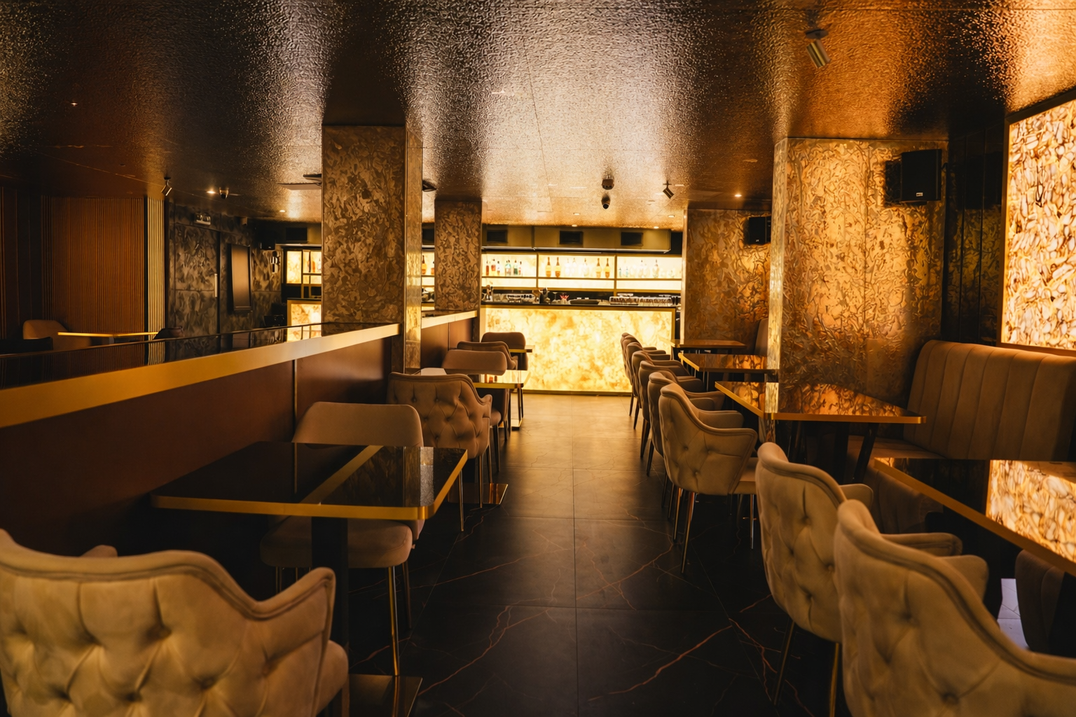 Descend into the Basement, a mysterious retreat where black, gold, and white converge to create an enigmatic atmosphere. The bar counter, adorned with intricate details, serves as the focal point. This space offers an exclusive escape for those seeking a more intimate and immersive dining encounter.