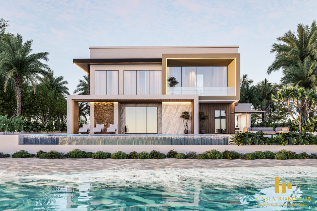 This villa design reflects a seamless blend of contemporary architecture and refined tropical living. Every line and proportion has been carefully composed to frame the natural surroundings incorporating lush palms, soft light, and the calm expanse of water. The exterior showcases a strong geometric rhythm, with cantilevered volumes and deep recesses creating a play of light and shadow that evolves throughout the day.