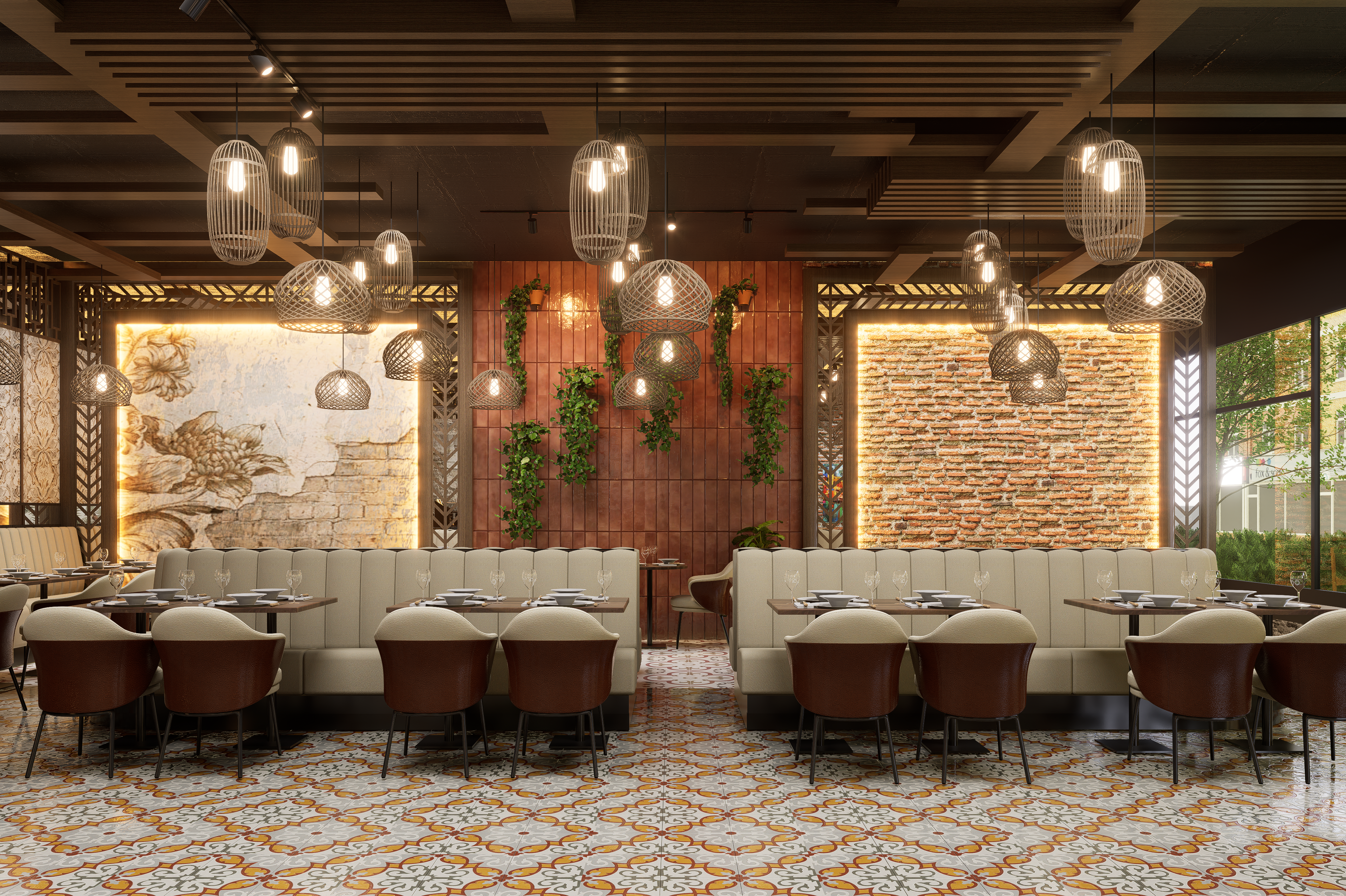 The design combines old-world charm with a fresh, stylish feel. The exposed brick walls add character, giving the space a slightly aged and textured look, much like a classic trattoria in Italy. Large arched niches with soft lighting create depth and a sense of openness, while decorative tiles on the floor add intricate patterns that bring a lively and artistic touch.