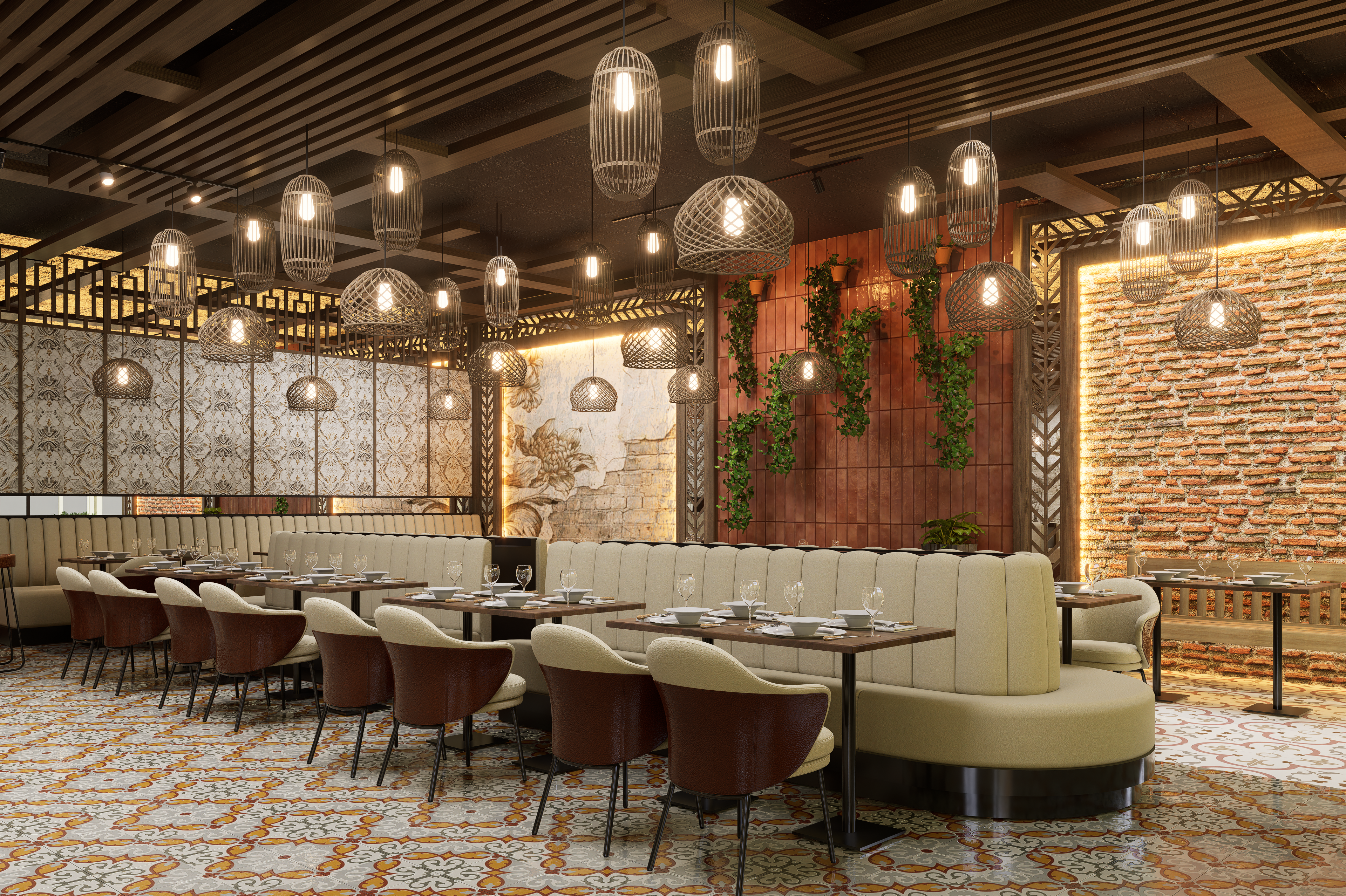 LED-backlit arches highlight the murals and textured walls, giving them a soft, golden glow. The lighting design is subtle yet effective, making sure every corner of the restaurant feels warm and inviting without being too bright or overpowering.