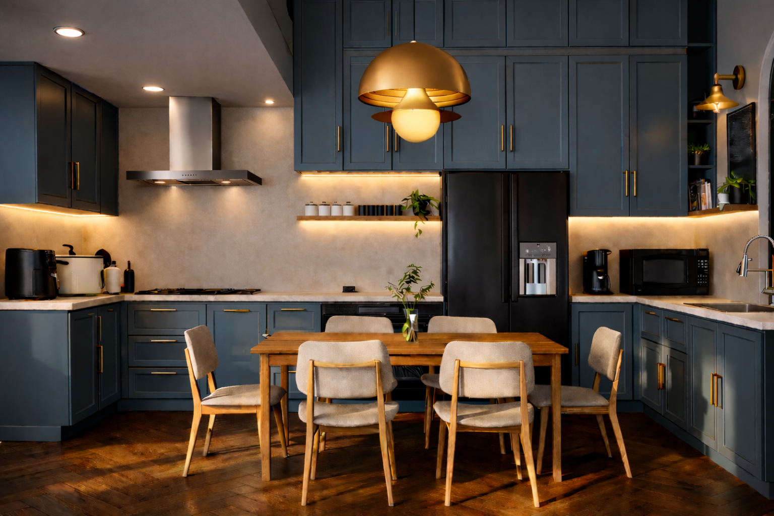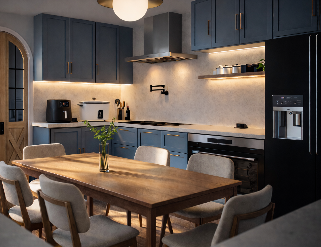 In this specific space, we took on the proportions of a high-ceilinged layout, utilizing deep midnight blue cabinetry to provide a bold, grounding backdrop. But the real magic? That lies in the ergonomic engineering.