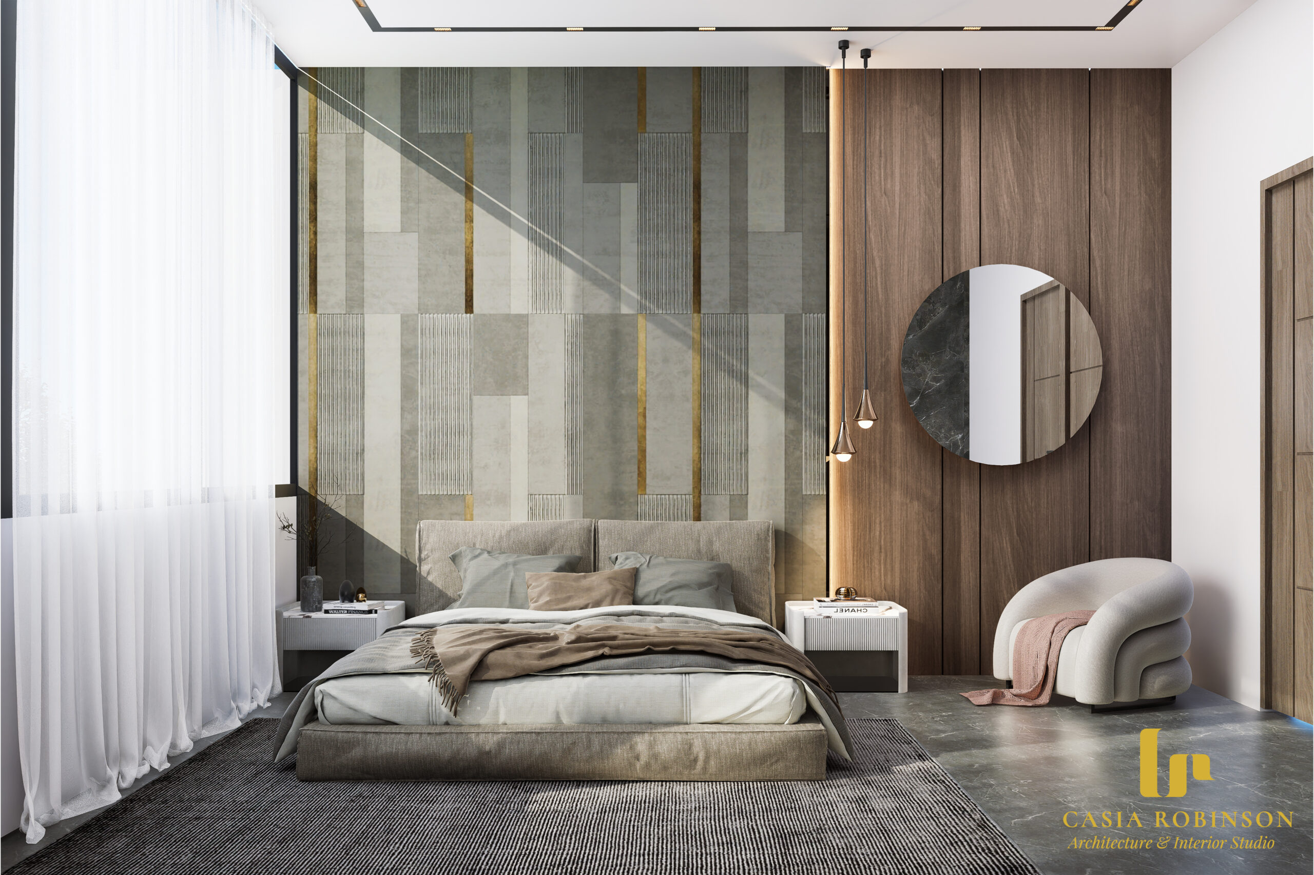 The bedroom highlights quiet luxury with a feature wall of textured dark stone that grounds the room with a sense of strength and calm. Subtle lighting frames the wall, creating depth and soft contrast against the neutral palette. The bedroom wall panelling design adds dimension while maintaining visual balance, enhancing the serene atmosphere. The furniture pieces like the upholstered bed, layered fabrics, and sculptural lighting that work together to express understated comfort while maintaining a sleek, contemporary edge. The use of monochrome accents completes the black and white bedroom design, offering a timeless aesthetic that feels both modern and intimate.