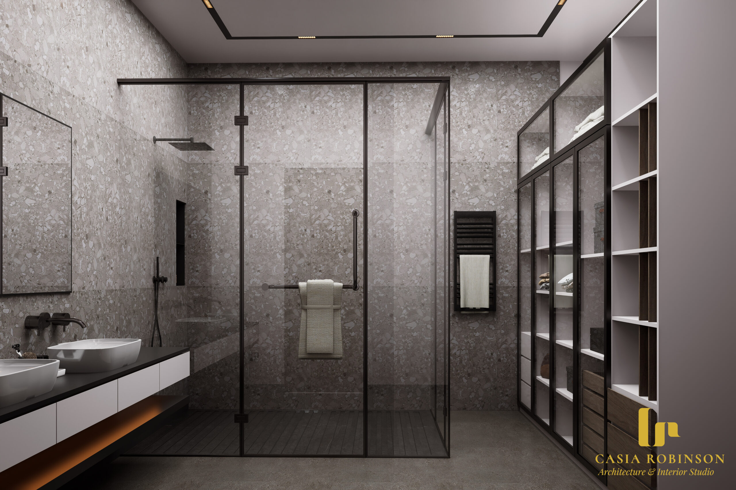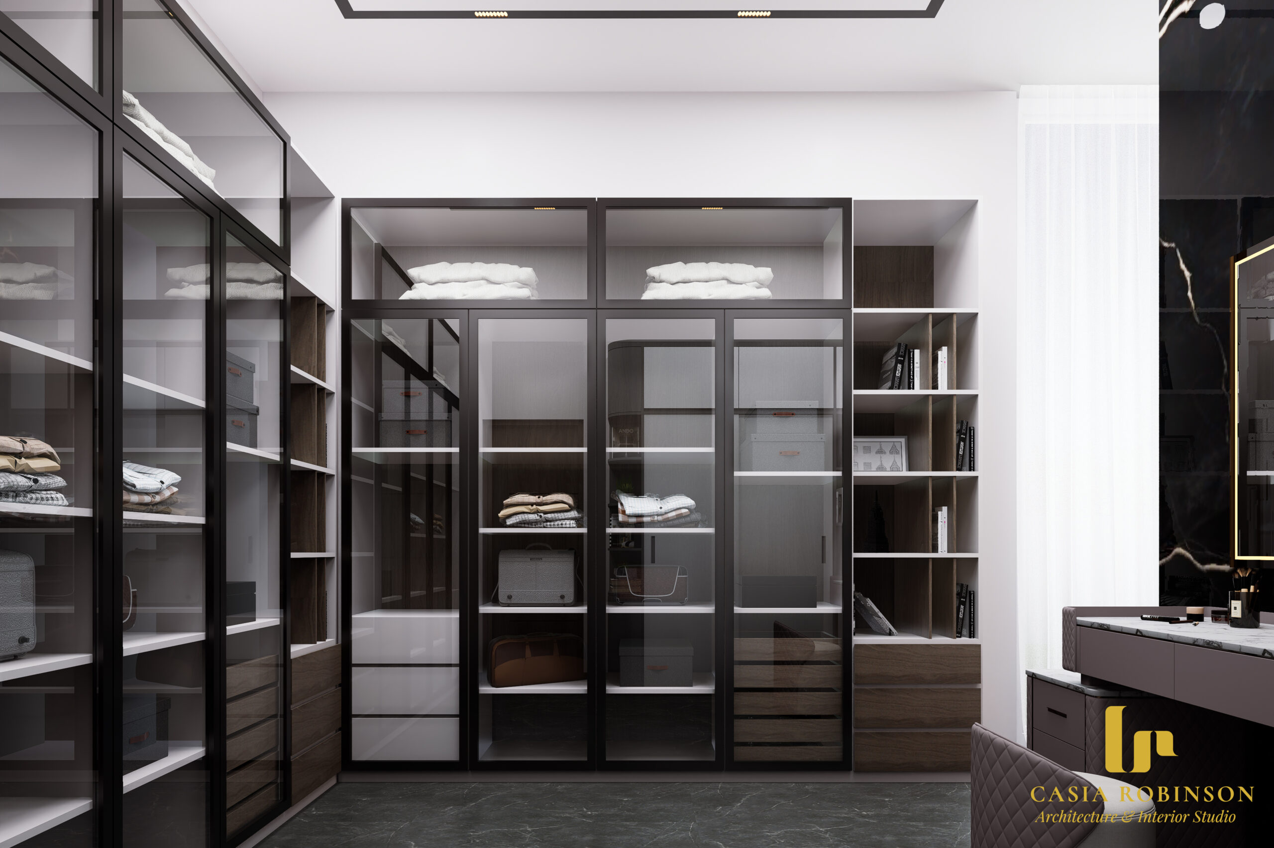The walk-in wardrobe completes the design narrative with precision and order. The interior modern wardrobe design features framed glass panels revealing an organised display of personal pieces. The combination of dark wood and soft lighting reinforces a sense of elegance and calm while reflecting the overall design theme of refined modern living.