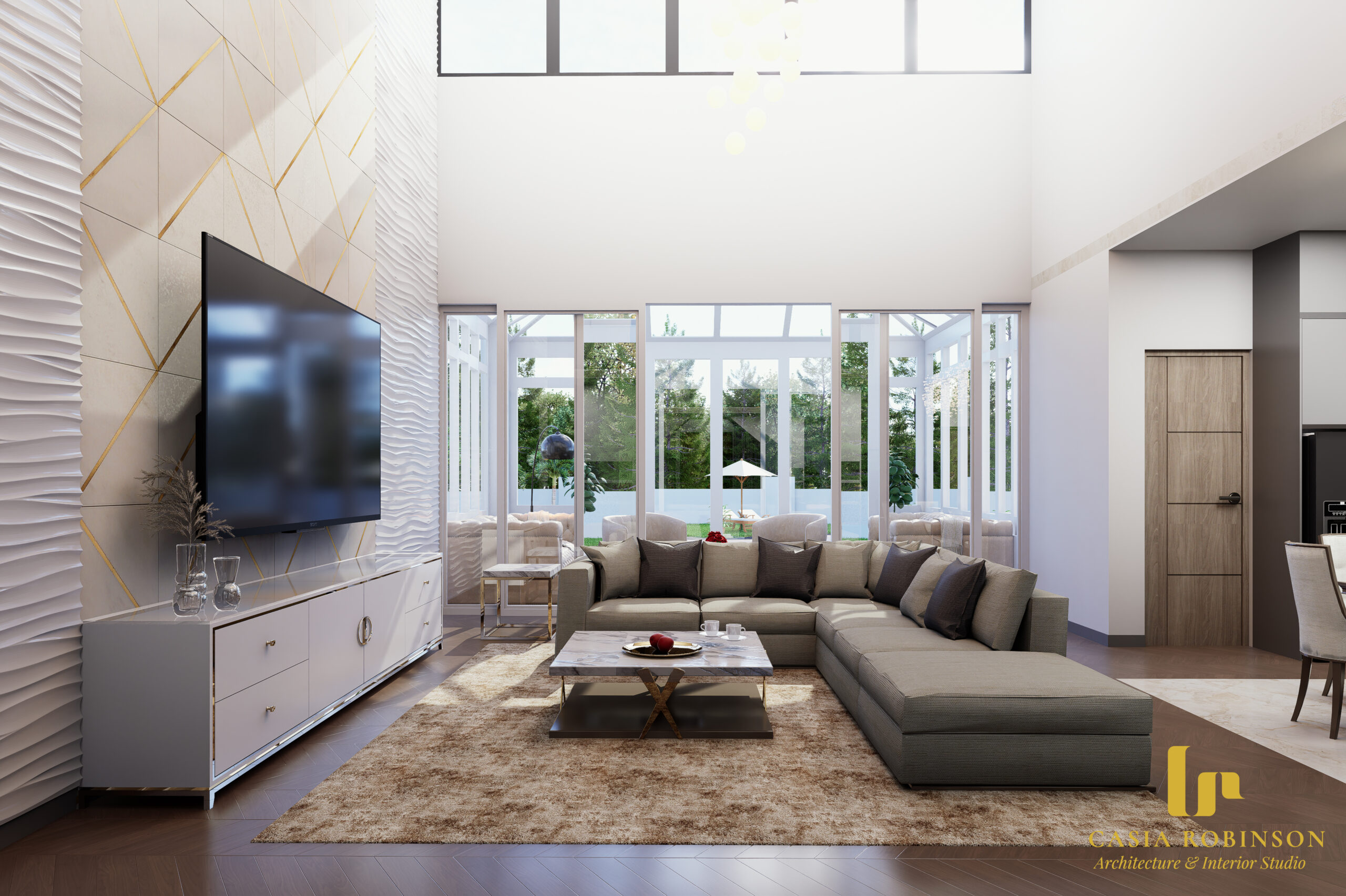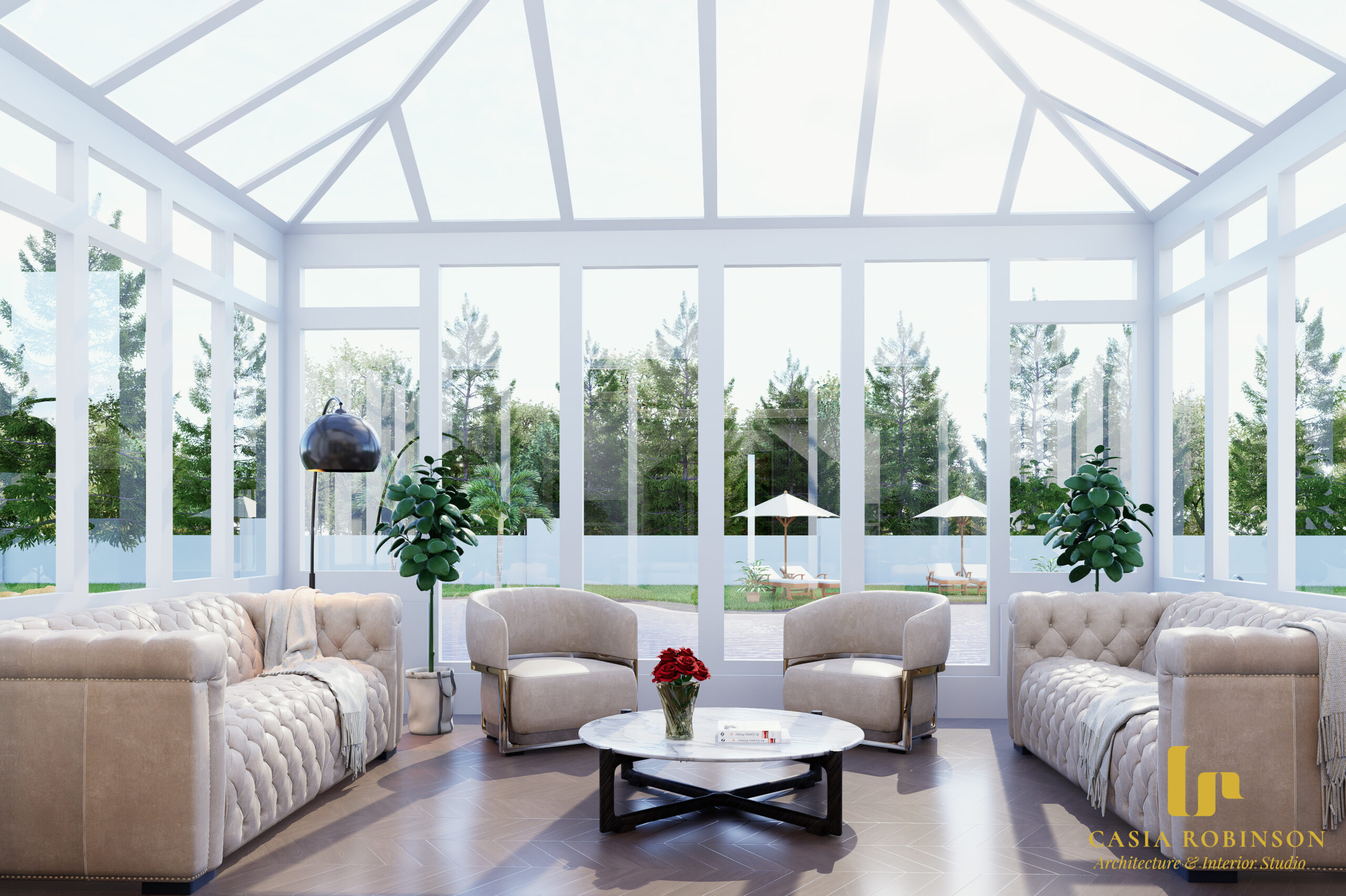 The living room opens into a bright, airy setting with full-height windows and a mix of textures depicting smooth white walls, geometric panels, and plush seating. Each element is placed to draw in natural light and create flow between indoor and outdoor areas. The adjoining conservatory extends this openness, framed by glass and surrounded by greenery, allowing the interior to blend seamlessly with the garden beyond.